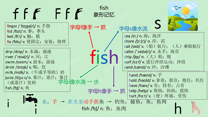 用象形方法,快速记忆单词fish:单词fish中的字母f有“手&rd...